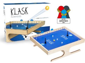 KLASK – der magnetische Kick ist ein Tischfußballspiel bei dem schnelle Reaktion, Geschicklichkeit und Taktik gefragt ist. Erschienen ist das Spiel bei dem Verlag Game Factory von dem Autor Mikkel Bertelsen.